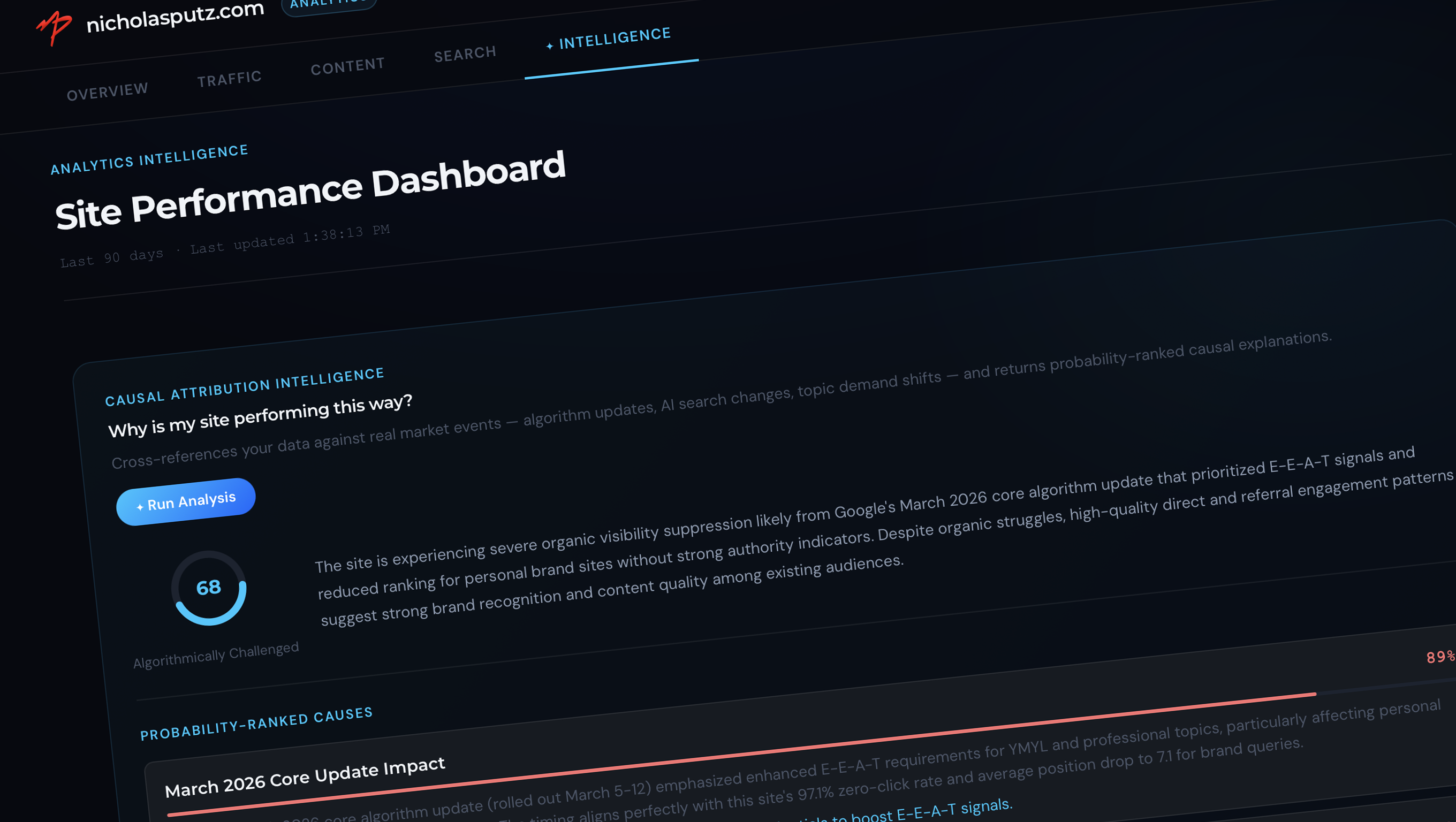 Most analytics tools tell you what happened. Causal Attribution Intelligence tells you why. It cross-references your performance data against a live database of real market events — Google core updates, AI Overview expansions, algorithm changes, demand shifts — and returns probability-ranked explanations for what caused your traffic and ranking changes. Instead of guessing why organic dropped 15% last week, you get: "March 2026 Core Update Impact — 89% probability" with the specific mechanism, the affected pages, and what to do about it. That's the difference between data and intelligence.